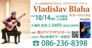 2026年10月14日(水) 18:30開演(18:00開場)  会場:西川アイプラザ5Fホール  入場料:前売3,500円(当日4,000円) チェコを代表するスーパーギタリスト「ヴラディスラフ・ブラハギターリサイタル […]